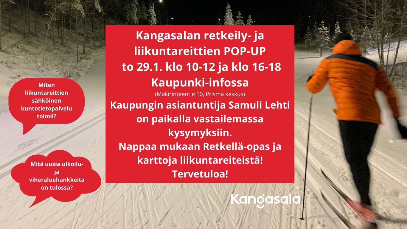 Kangasalan kaupunki ylläpitää noin 100–150 km maastohiihtolatuja, ja latujen pituus elää talven säätilanteen mukaan. Luistelukenttiä ja kaukaloita kaupungilla on yhteensä 23 kpl ja ne ovat vapaasti kaikkien käytössä. Lisätietoa Harrastaminen ja vapaa-aika -sivuilta.