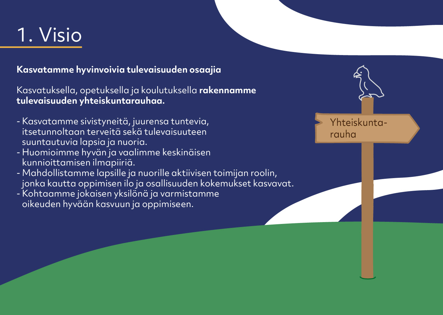 Kasvatamme juurensa tuntevia, itsetunnoltaan terveitä ja tulevaisuuteen suuntautuvia lapsia ja nuoria, joissa korostuvat suvaitsevaisuus, sivistyneisyys ja kansainvälisyys. Kunnioitamme lasten ja nuorten omia näkemyksiä ja omaa kokemusmaailmaa.