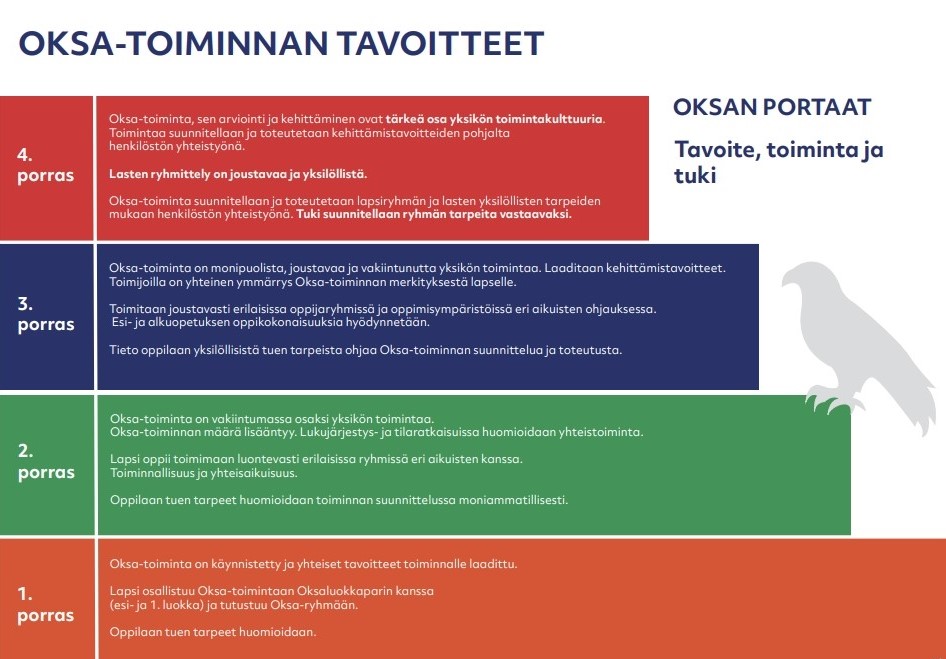 OKSA-toiminnassa lapsen yksilöllinen huomioiminen, oikea-aikainen tuki ja osallisuus mahdollistuvat yhteisaikuisuuden myötä. Esi- ja alkuopetusikäiset lapset toimivat joustavasti erilaisissa oppimisryhmissä. OKSA-toiminta madaltaa koulun aloittamisen kynnystä.