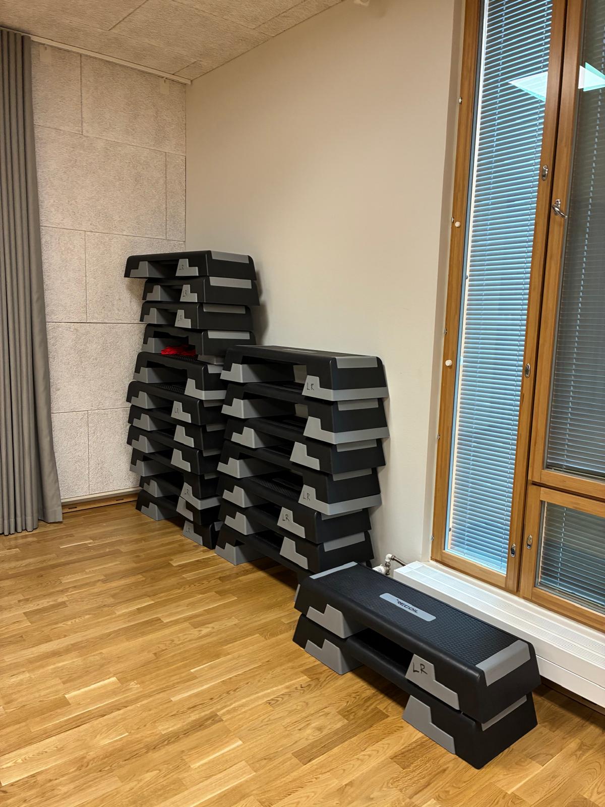 Liikuntasalissa ei ole erikseen katsomoa, mutta sivussa on pieni käytävätila, johon voi laittaa tuoleja.