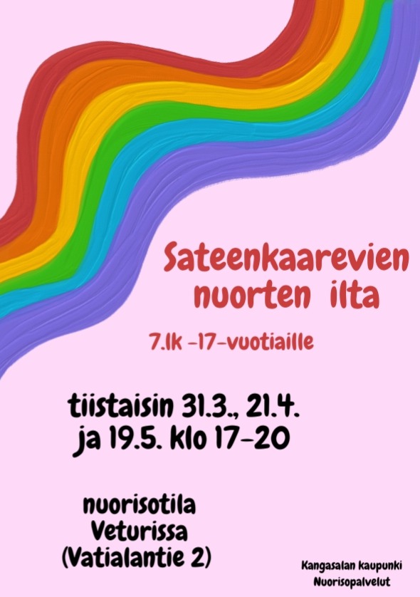 Kangasalan kaupunki käynnistää pitkään odotetun sateenkaarevien nuorten oman nuorisotilatoiminnan tiistaina 31.3. klo 17.00 Vatialan nuorisotila Veturissa osoitteessa Vatialantie 2. Uusi toiminta on suunnattu 7.-luokkalaisista 17-vuotiaisiin nuoriin, jotka kokevat kuuluvansa sukupuoli- ja seksuaalivähemmistöihin tai jotka pohtivat sateenkaarevuuttaan.