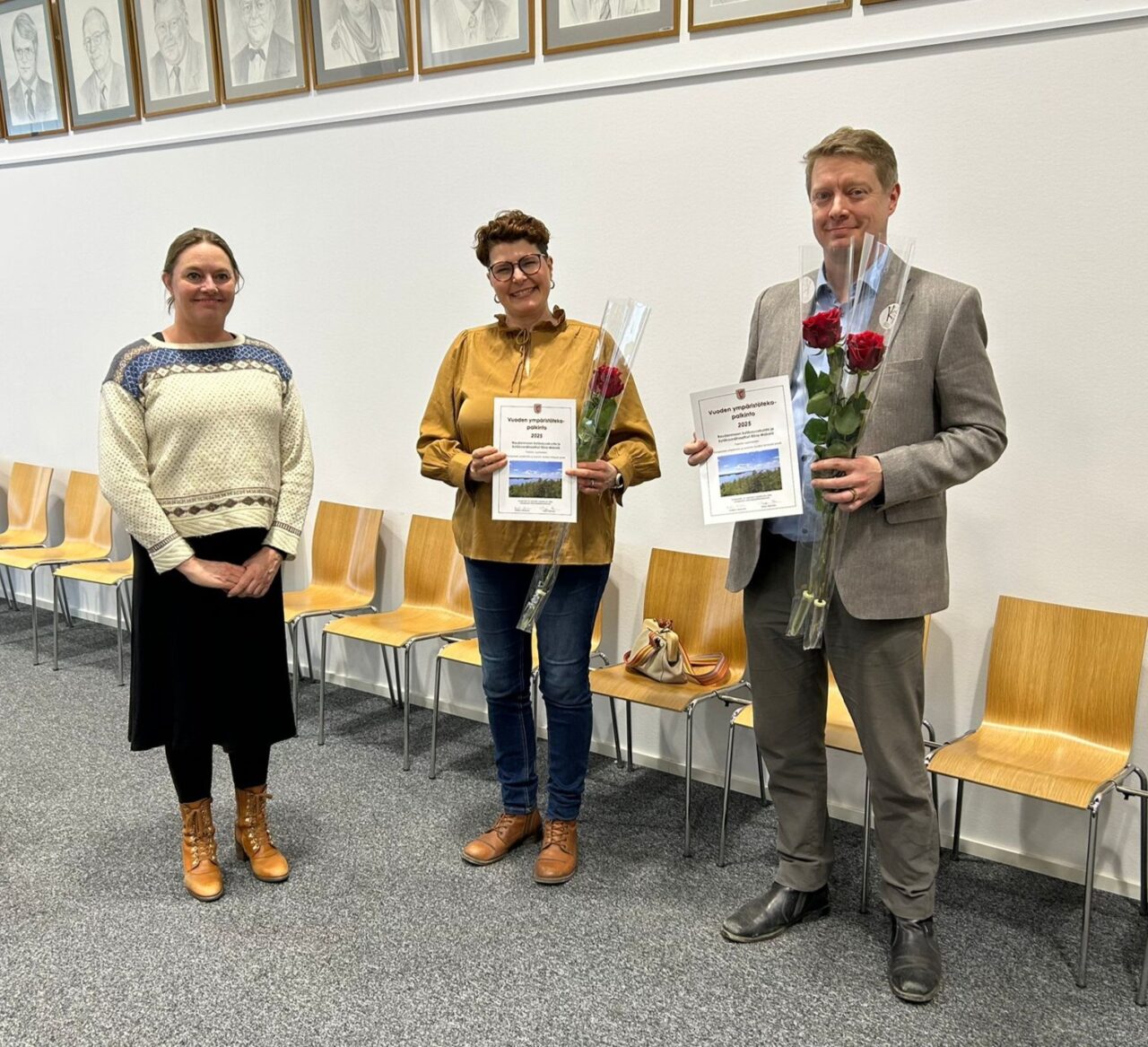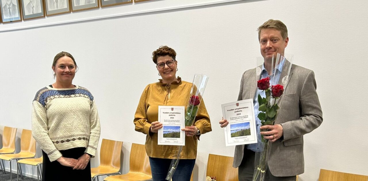 Kuvassa Kristiina Härkönen, palkintotoimikunnan puheenjohtaja ja kaupunginvaltuutettu sekä palkinnon vastaanottaneet Jussi Tanila ja Pirkko Syrjäläinen.