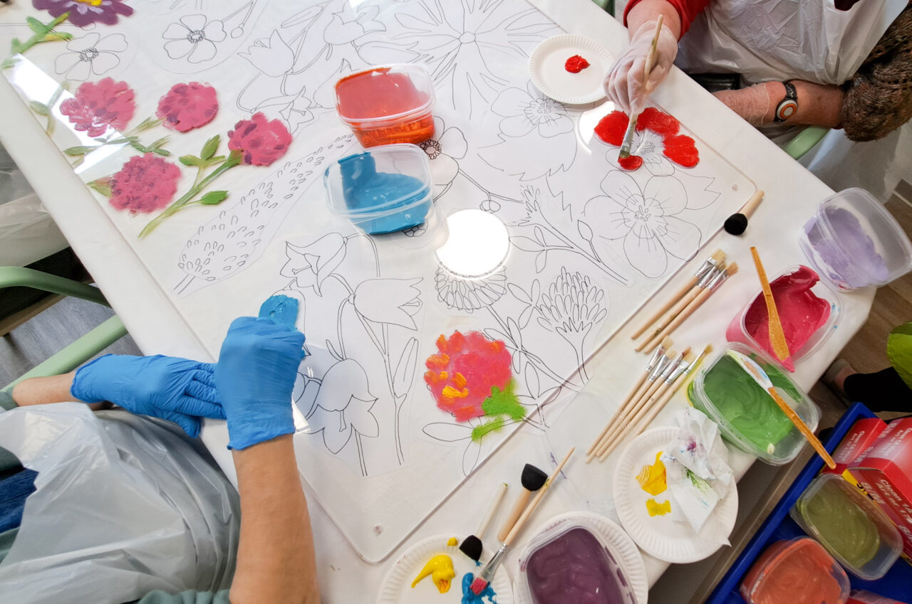 Niittykukkia-yhteisötaideteos on kuvataiteilija Mari Hillon konseptoima. Sahalahden Höllinkodon asukkaat maalaavat läpinäkyvälle pleksille erilaisia kukka- ja kasviaiheita taiteilijan ohjeiden mukaisesti. Kuva: Kangasalan kulttuuripalvelut.