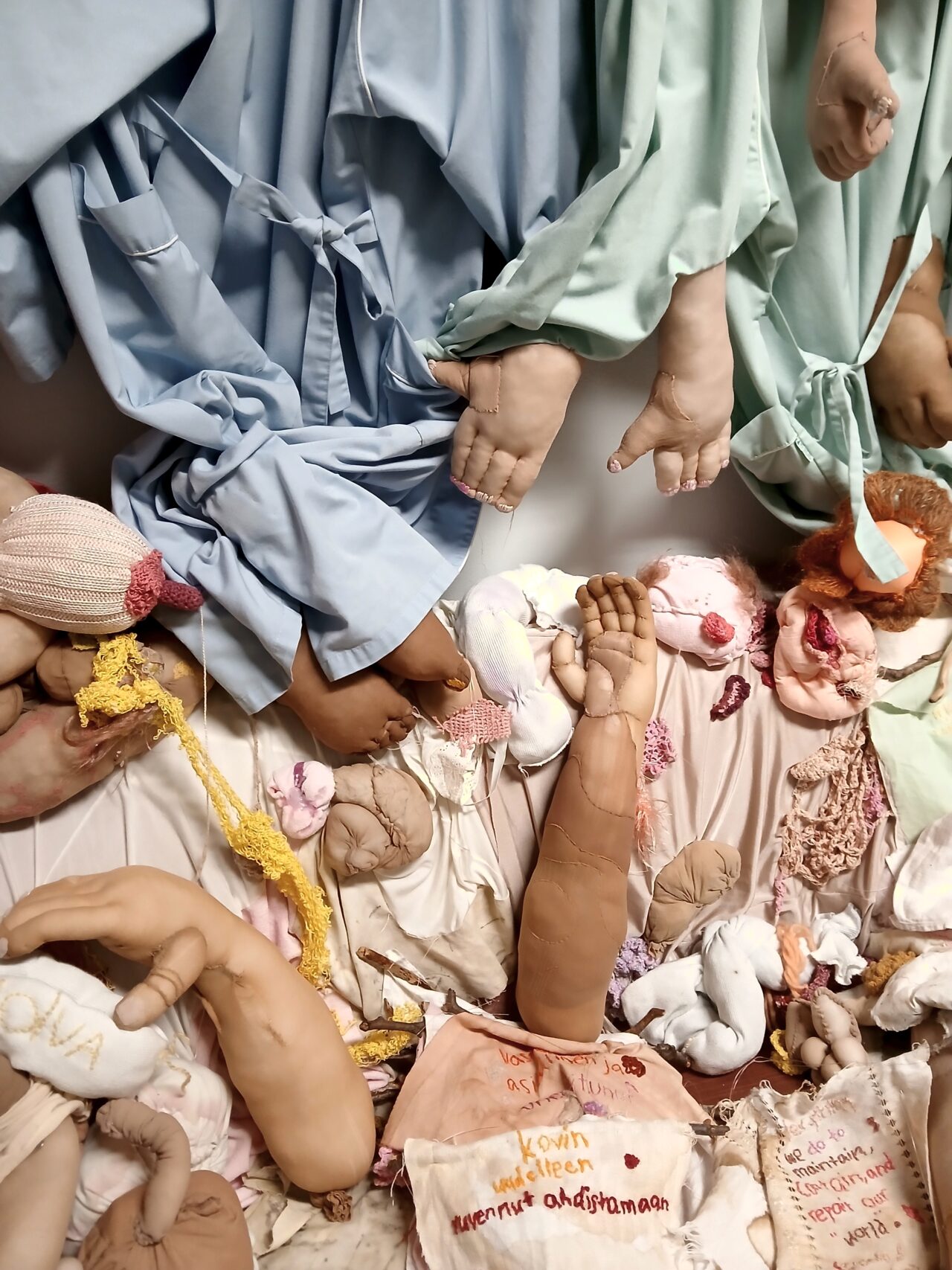 “Piittaamisen pistot” on taidekollektiivi Kääpäjaoston näyttely, jossa tutkitaan elämää hoivatekstiilien, lankojen, kirjottujen ja virkattujen elementtien, vanhojen sairaanhoidon oppikirjojen, omien potilastekstien ja feministisen tieteis-utooppisen kuvittelun avulla. Kaikkien eliöiden elämän perustana on hoiva, joka tarjoaa, mutta myös tarvitsee suojaa. Näyttelyn teokset ovat pieniä ja suuria tekstiiliteoksia. Näyttelyssä piittaamisen välineinä ovat neulat ja virkkuukoukut, joiden avulla pitkitetään sairaalakäytöstä poistettujen tekstiilien elämää hoivan muistomerkkeinä.