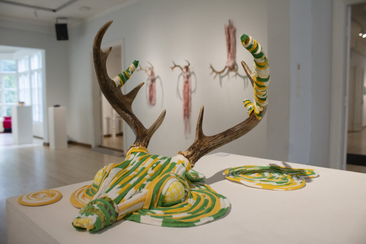 Timo Höyssä: ”Muddle Puddle”, 2024, kauriin kallo, matonkude, vanu, liima