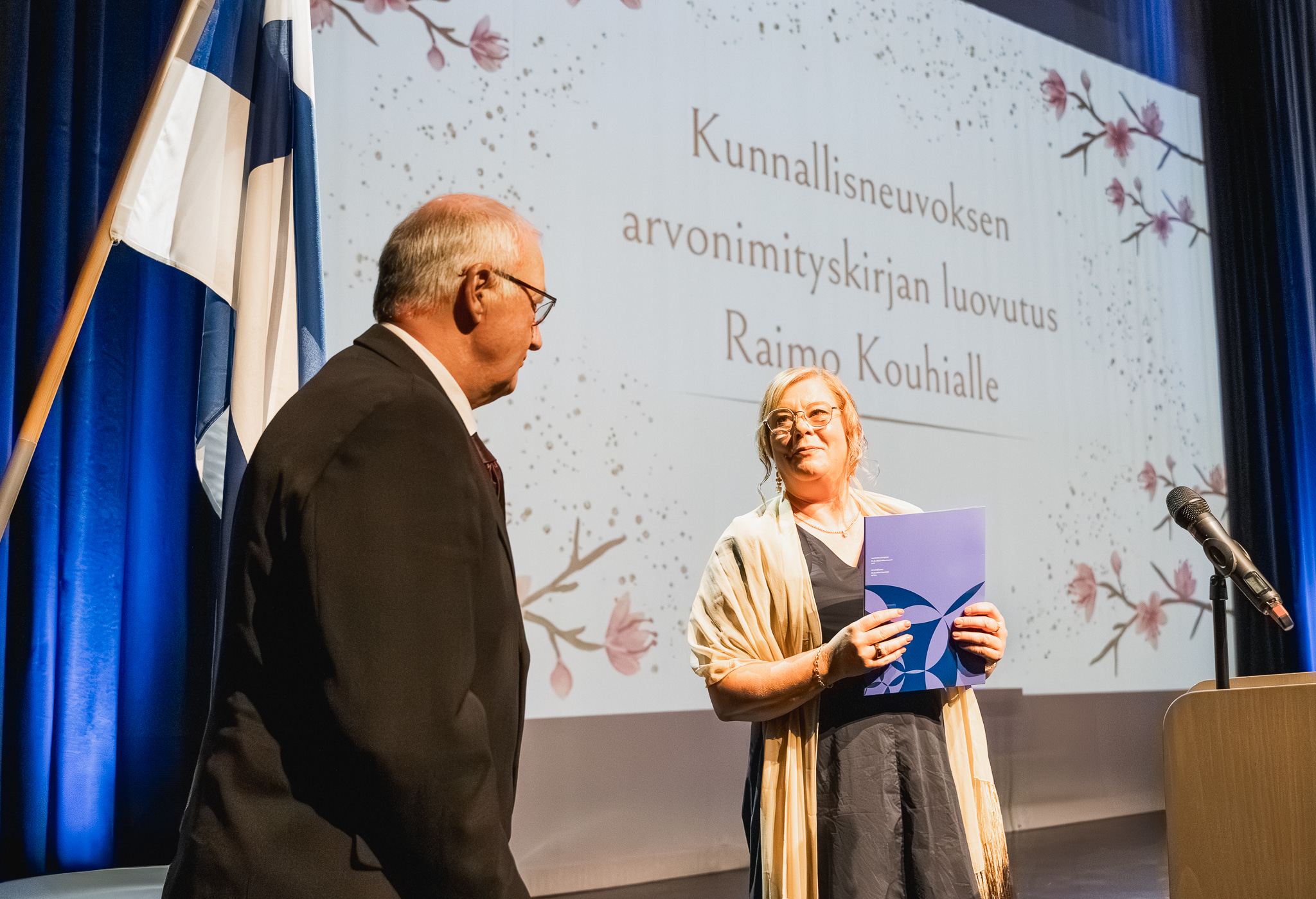 Tilaisuudessa luovutettiin myös tasavallan presidentin myöntämä kunnallisneuvoksen arvonimityskirja yli neljä vuosikymmentä kuntapäättäjänä toimineelle Raimo Kouhialle.