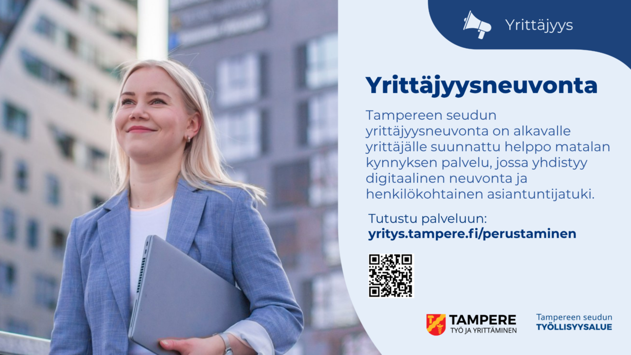 Yrittäjyysneuvonta on Tampereen seudun työllisyysalueen uusi palvelu yrittäjyyttä pohtiville ja aloittaville yrittäjille. Huhtikuun 2026 alussa käyttöön otettava palvelukokonaisuus yhdistää ympärivuorokautisen digitaalisen neuvonnan ja henkilökohtaisen asiantuntija-avun.